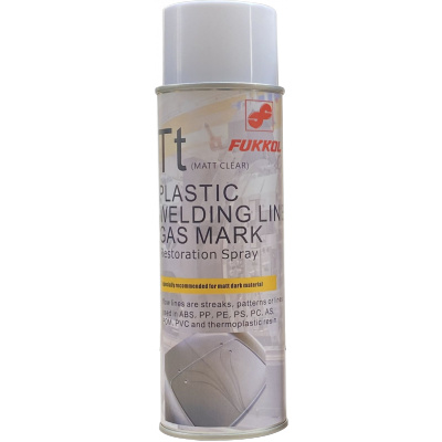 FUKKOL TT Weling Line and Gas Mark Restoration Spray-Matt Clear the synthetic resinspecially designed by the restoration spray it is suitable to fix the plastic welding line and gas mark for the injection molding problem, it effectively repair the defective plastic products surface,FUKKOL TT Weling Line and Gas Mark Restoration Spray-Matt Clear can provide the performance of reducing color for the metal surface, and can change the bright light into the matt effect. After spraying the restoration spray layer, the surface can produce the original matte effect and excellent abrasive of the surface It is attached to metal and other plastic surfaces to effectively repair the color tolerance .It recommended can be used in ABS, PP, PE, PS, PC, as, POM, PVC and thermoplastic resin.Especially recommended for: black or dark materials for black and light colors use matt transparent color.