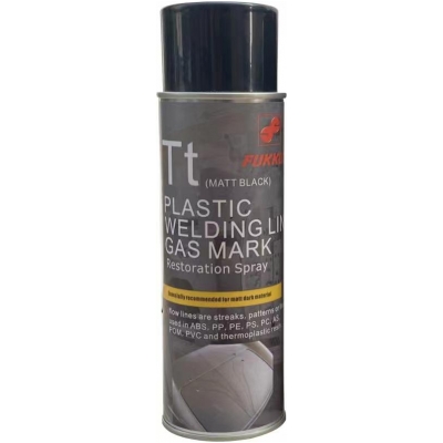 FUKKOL TT Weling Line and Gas Mark Restoration Spray-Matt Black the synthetic resin specially designed by the restoration spray it is suitable to fix the plastic welding line and gas mark for the injection molding problem, it effectively repair the defective plastic products surface, FUKKOL TT Weling Line and Gas Mark Restoration Spray can provide the performance of reducing color for the metal surface, and can change the bright light into the matt effect. After spraying the restoration spray layer, the surface can produce the original matte effect and excellent abrasive of the surface It is attached to metal and other plastic surfaces to effectively repair the color tolerance .It recommended can be used in ABS, PP, PE, PS, PC, as, POM, PVC and thermoplastic resin.Especially recommended for: black or dark materials for black and light colors use matt transparent color.